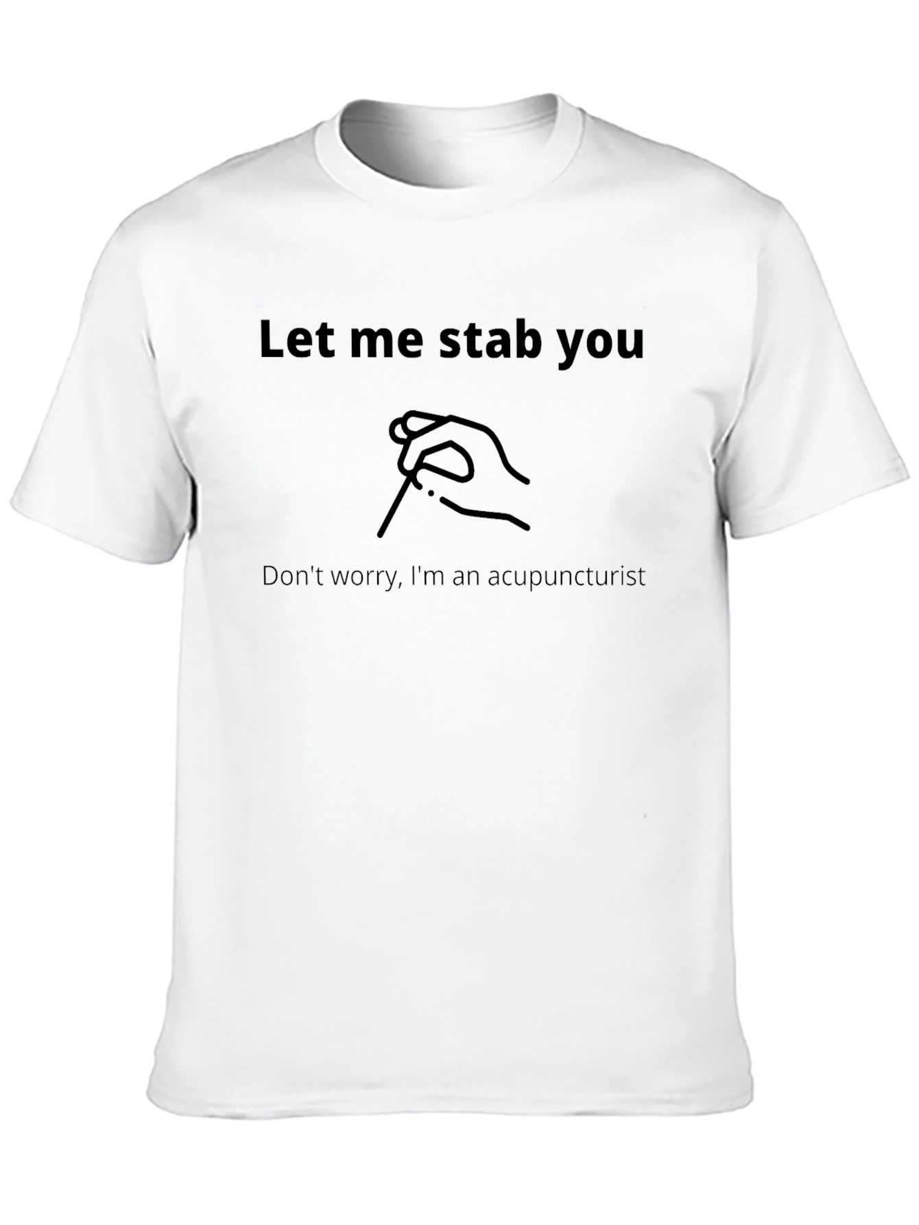 This black t-shirt features a humorous and ironic design for acupuncturists. The text "Let me stab you" is printed above a simple graphic of a hand holding an acupuncture needle. Below, the shirt reads, "Don't worry, I'm an acupuncturist." This tee is perfect for acupuncture practitioners looking to add a touch of humor to their wardrobe. Made from a soft-looking fabric, this shirt is comfortable for everyday wear. Show off your profession with a lighthearted twist!