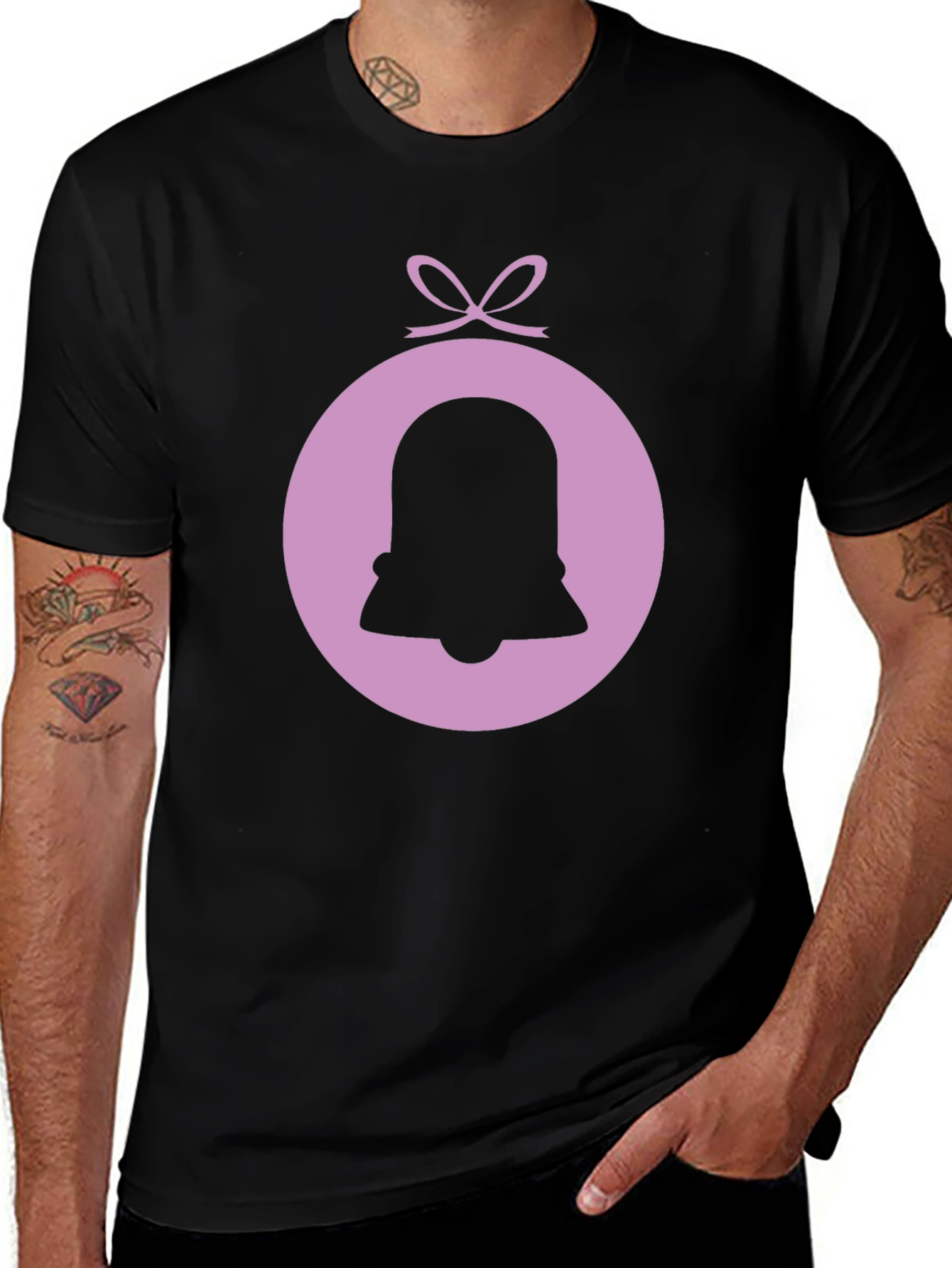 Show off your festive spirit with this stylish black t-shirt featuring a unique bell ornament graphic. The design showcases a lilac-colored circle enclosing a dark bell silhouette, topped with a charming bow. Made from comfortable, breathable fabric, this tee is perfect for casual wear during the holiday season or any time you want to add a touch of whimsy to your wardrobe. The eye-catching ornament design makes it a great conversation starter and a fun way to express your individuality. Pair it with jeans for a relaxed look or dress it up with a blazer for a more polished style. This trendy t-shirt is sure to become a favorite in your collection.