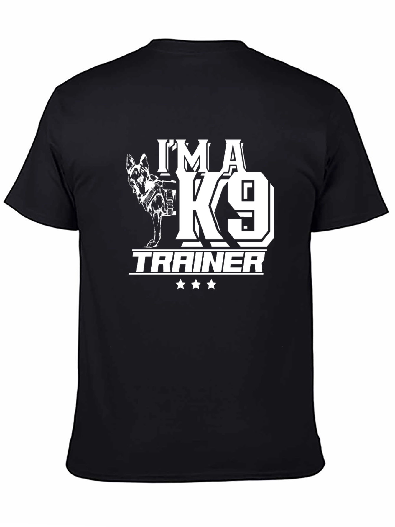 Show your passion for canine training with this stylish black t-shirt. The shirt features a bold white graphic that includes a detailed image of a German Shepherd in a harness, along with the text "I'M A K9 TRAINER" and three stars beneath. Made from comfortable fabric, this shirt is perfect for everyday wear, dog training sessions, or casual outings. Its design proudly displays your dedication to working with K9 units, making it an excellent conversation starter for fellow dog enthusiasts. A must-have for any professional or hobbyist K9 trainer!