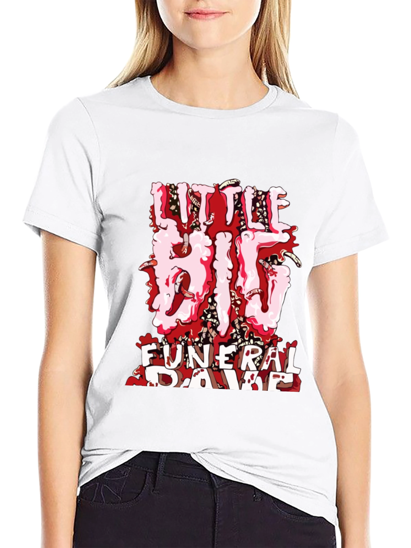 Show your love for Little Big with this black t-shirt featuring the bold "Funeral Rave" design. This eye-catching design features a red and white graphic that is sure to turn heads. Made from comfortable materials, this shirt is perfect for everyday wear or for rocking out at your next rave. Whether you're a die-hard Little Big fan or just love unique graphic tees, this shirt is a must-have addition to your wardrobe. Get yours today and let the rave begin!