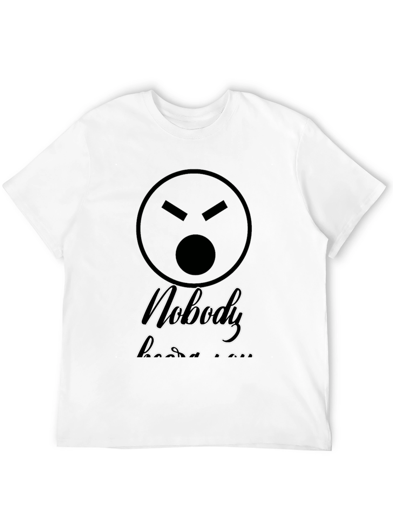 This black t-shirt features a bold graphic design for those with a sarcastic sense of humor. The design includes a stylized, annoyed-looking face above the statement "Nobody hears you...". The shirt is made of a soft-looking material, perfect for casual wear. Its classic fit is suitable for everyday activities, whether you're lounging at home or out and about. Show off your wit and make a statement with this unique and humorous tee.